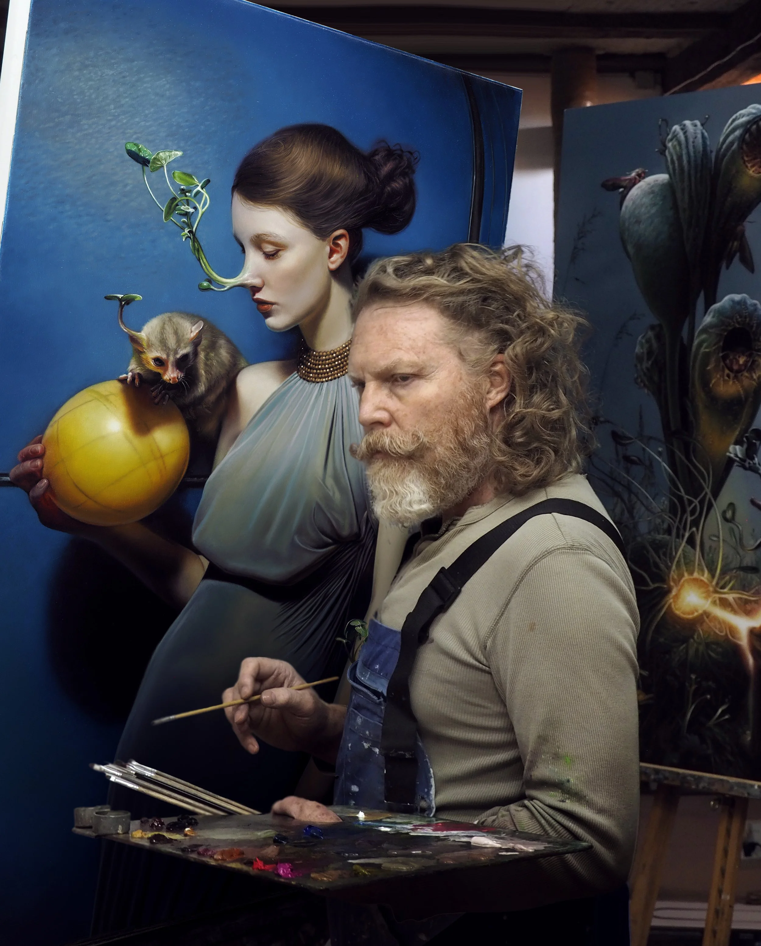 In The Death of Pan, we see the mourning of the wild, a Greco-Roman archetype used to comment on our modern ecological anxieties. By giving the mythic god a tangible presence, the artist forces us to confront the literal loss of nature. Lost in the Cosmos depicts an ethereal woman in what could be an astronaut’s suit of silver, un-helmeted, surrounded by a floating dream of orbs and planetoids. Similarly, Acrobats and Blue Bird utilize the precision of realist brushwork to capture a sense of precarious balance and fleeting hope—depicting scenes that feel like dreams, but that still carry the emotional weight of a lived memory. These are not escapes from reality; they are heightened interpretations of it.