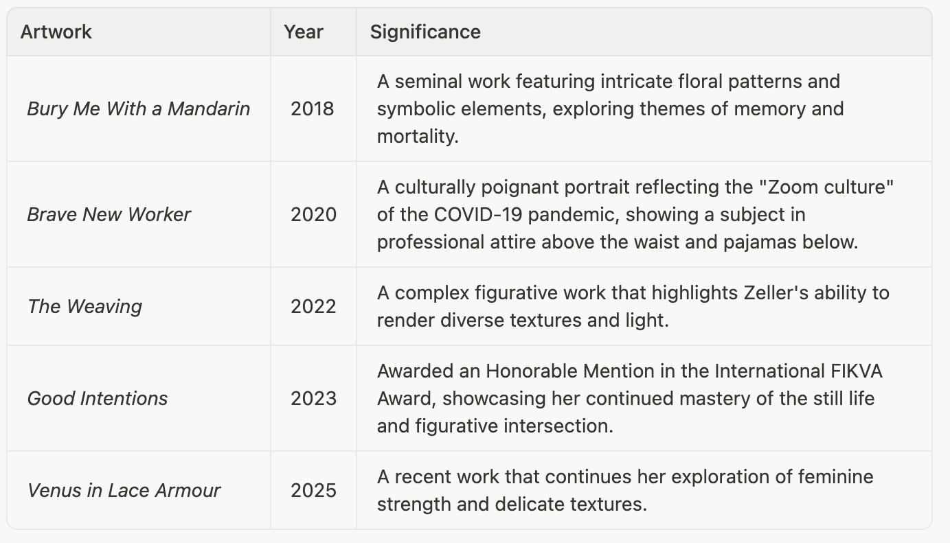 One of Zeller’s most recognized pieces, Brave New Worker, serves as a historical document of the early 2020s. By capturing the duality of the "work-from-home" era—business on top, comfort on the bottom—Zeller moved beyond traditional portraiture to provide a relatable, humorous, yet technically flawless commentary on a global shift in the human experience. The painting received a "Highly Commended" award at The Lester Prize for Portraiture in 2021.