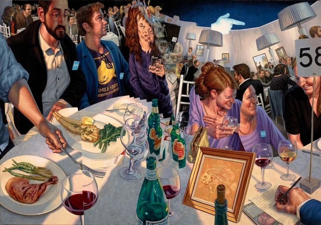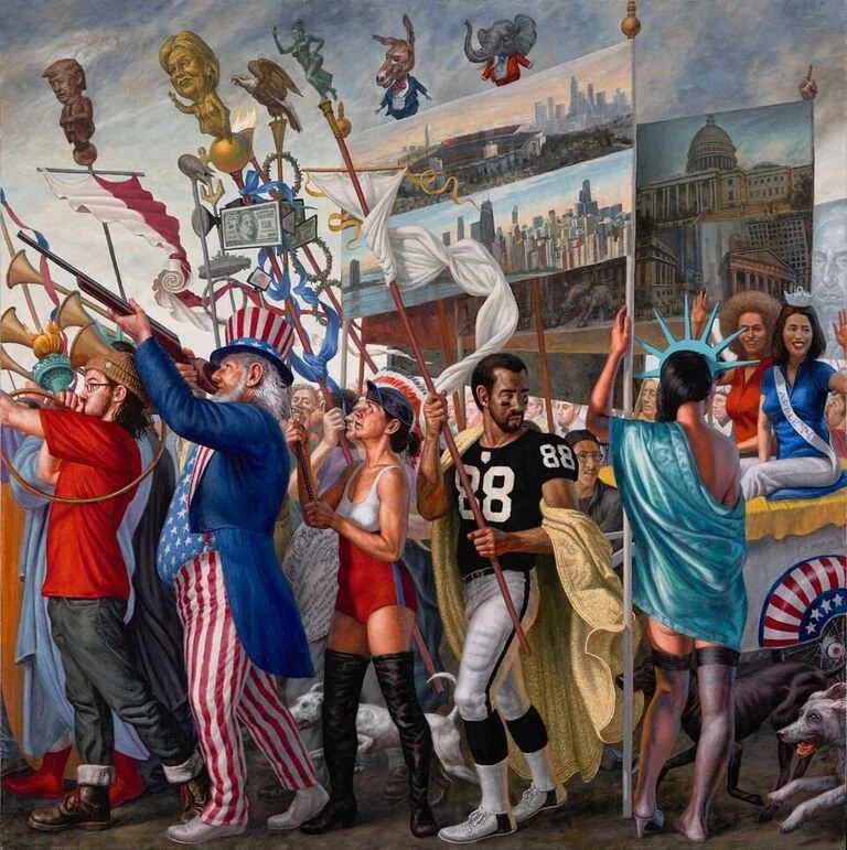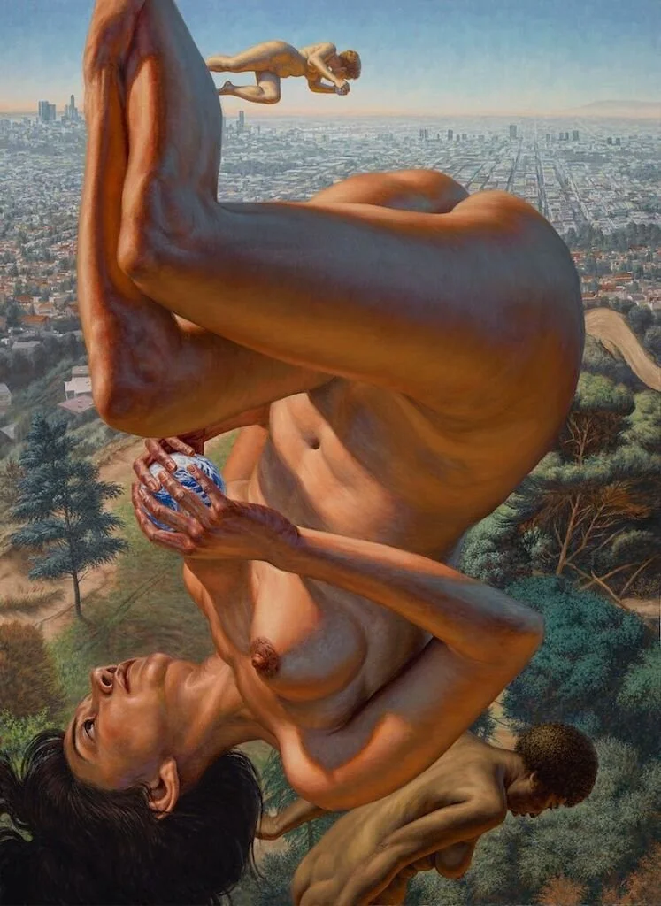 “I was sick, with a high fever, and dreamed that the history of art was coming out of our second floor toilet, like a giant mummy-worm full of paintings and sculptures. It rumbled down the hallway, out the door, and down the highway. Suddenly I was caught up in the history of Art, and it was horrible. I was wrapped up with a couple of paintings that had made me famous and was bouncing uncomfortably down the highway when the history of art was struck by a Cadillac Eldorado. I was blown out of it into a nearby ditch, and as I lay dying my last words were, “Thank God I’m not in the History of Art anymore!” I woke up then, and 40 years later I am making a painting about that dream, my legacy, and my own mortality. It has the spiral of art history, which is not unlike the daily cascade of online imagery, and some muses or guardian angels flying in around the breach of the Cadillac. The three women are nude because I don’t know what guardian angels wear, and one of them seems to want to ward off death, the skeleton figure to the right. There are thousands of little images from art history.”